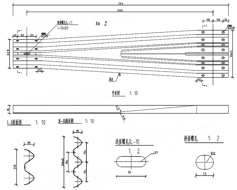 波形護欄過渡板是指在一些特殊的路段,需要同時使用雙波形護欄和三波形護欄時,可以使不同規格的梁板連接在一起,能夠流暢過渡的特殊護欄板。而雙波護欄和三波護欄的截面是不一樣的,在這種情況下就需要使用一種規格為(506-310)85*4320*3/4mm或(506-310)85*2320*3/4mm的過渡板。